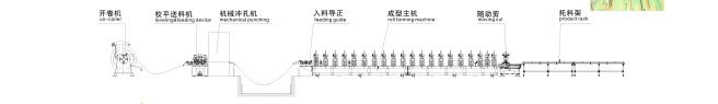 上料平台—开卷机—伺服送料—冲孔冲压—辊压成型—切断—翻转送料